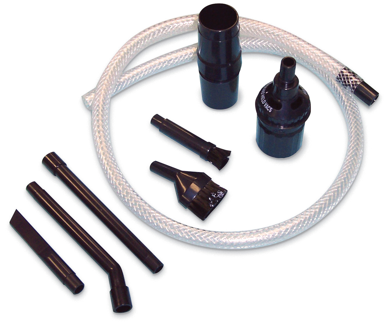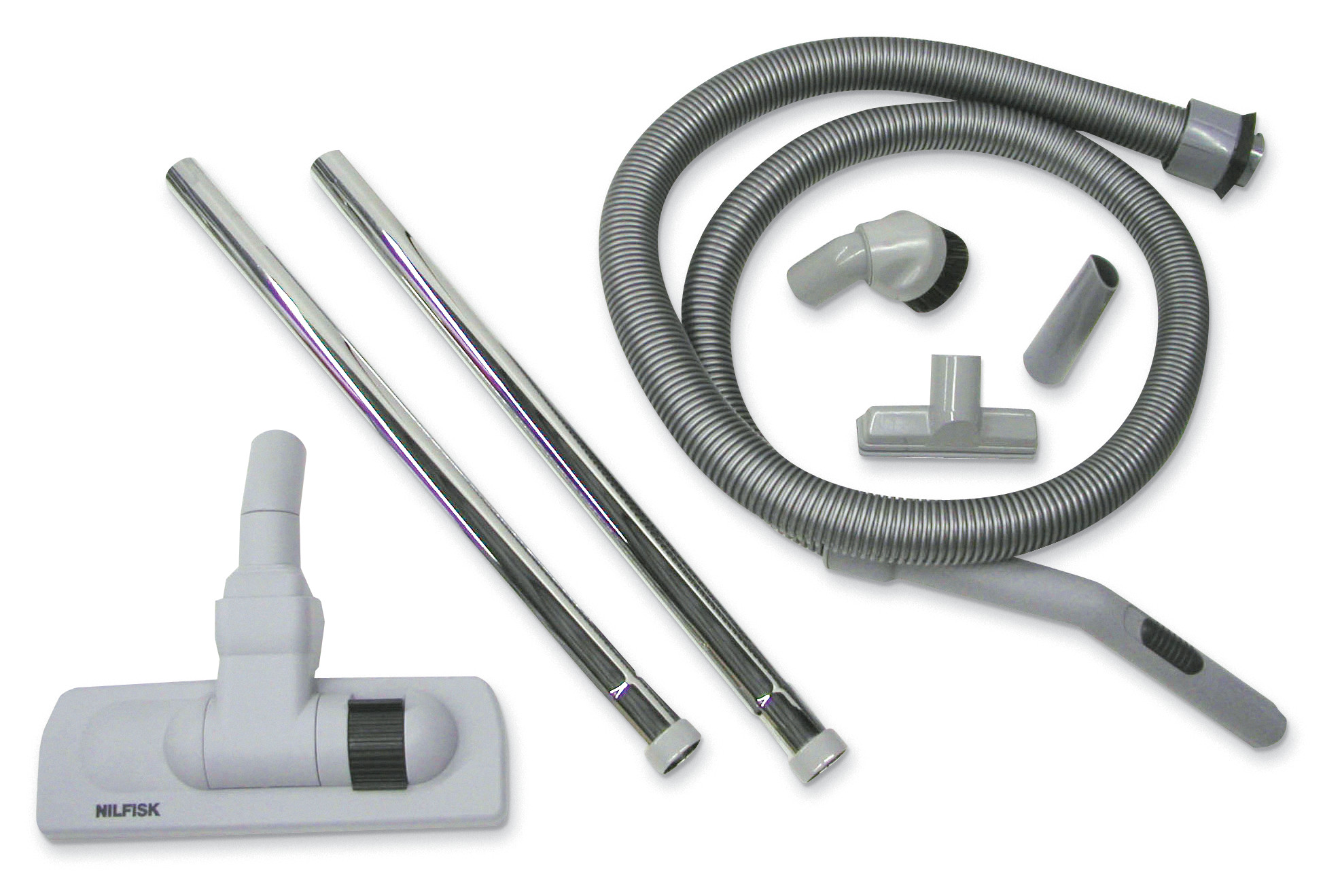 • Includes vacuum, 6 1/2 ft. plastic hose w/curved tube and bleeder, microfilter, two straight steel wands, 3" dust brush, 2-in-1 floor nozzle w/retractable brush, 5" upholstery nozzle, 6" conductive crevice nozzle, micro tool kit and detachable trolley