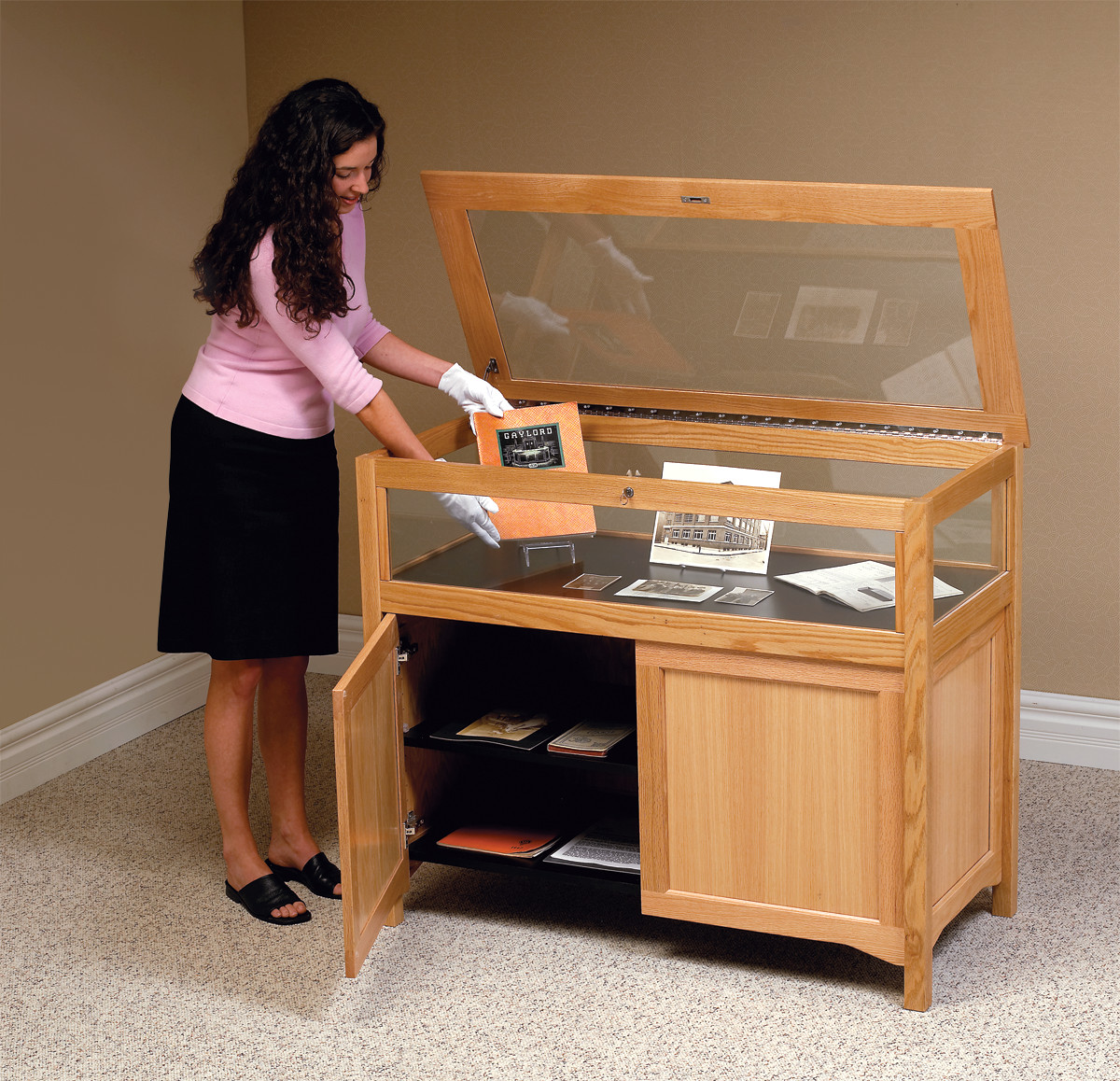 The Gaylord Archival® Eastwood™ Cabinet Base Exhibit Case features finely crafted solid oak construction and a traditional cabinet design. The top of the case opens on piano hinges for arranging your collection and locks automatically when closed. The cabinet base with stylish recessed panels includes an adjustable shelf for versatile storage.