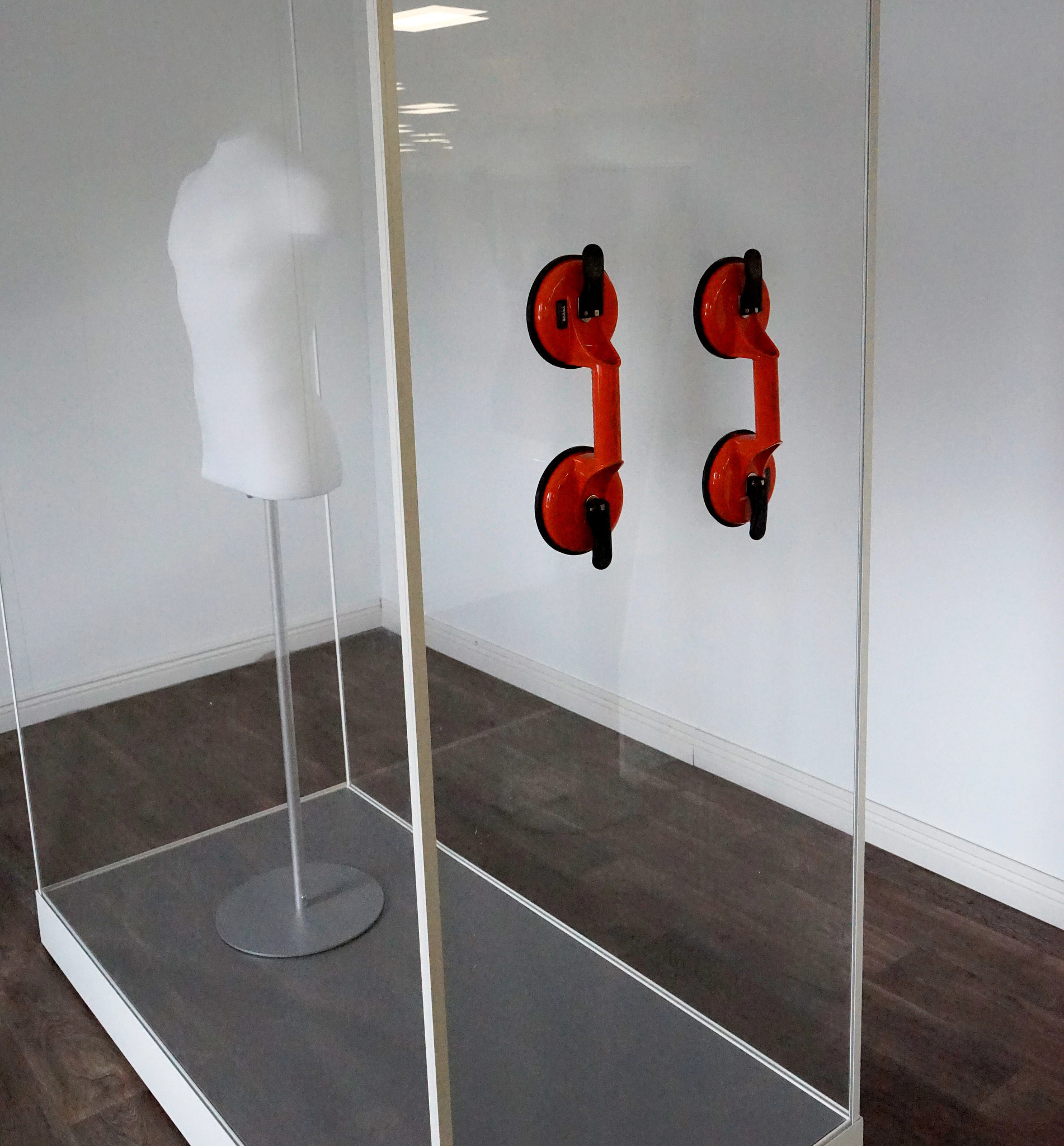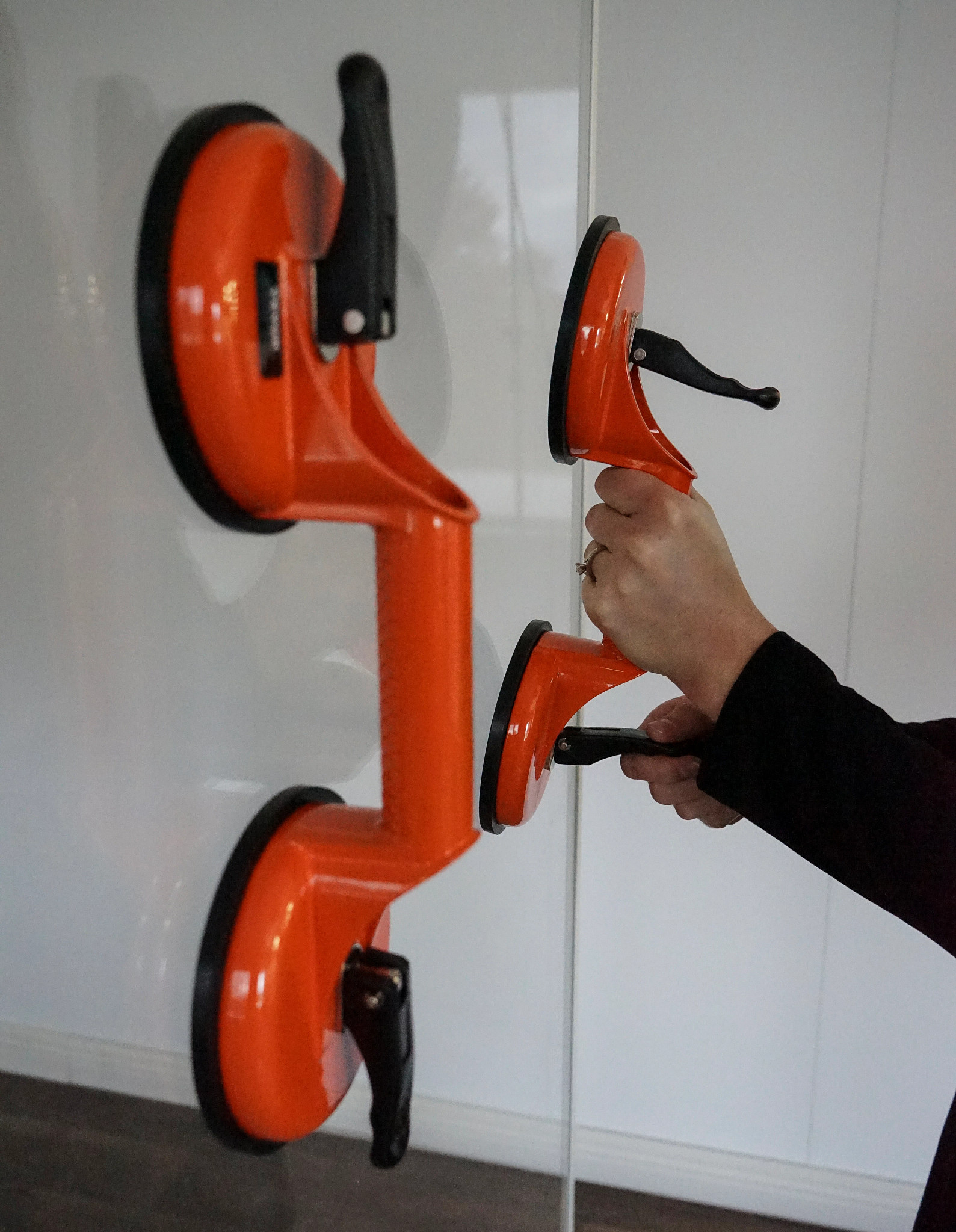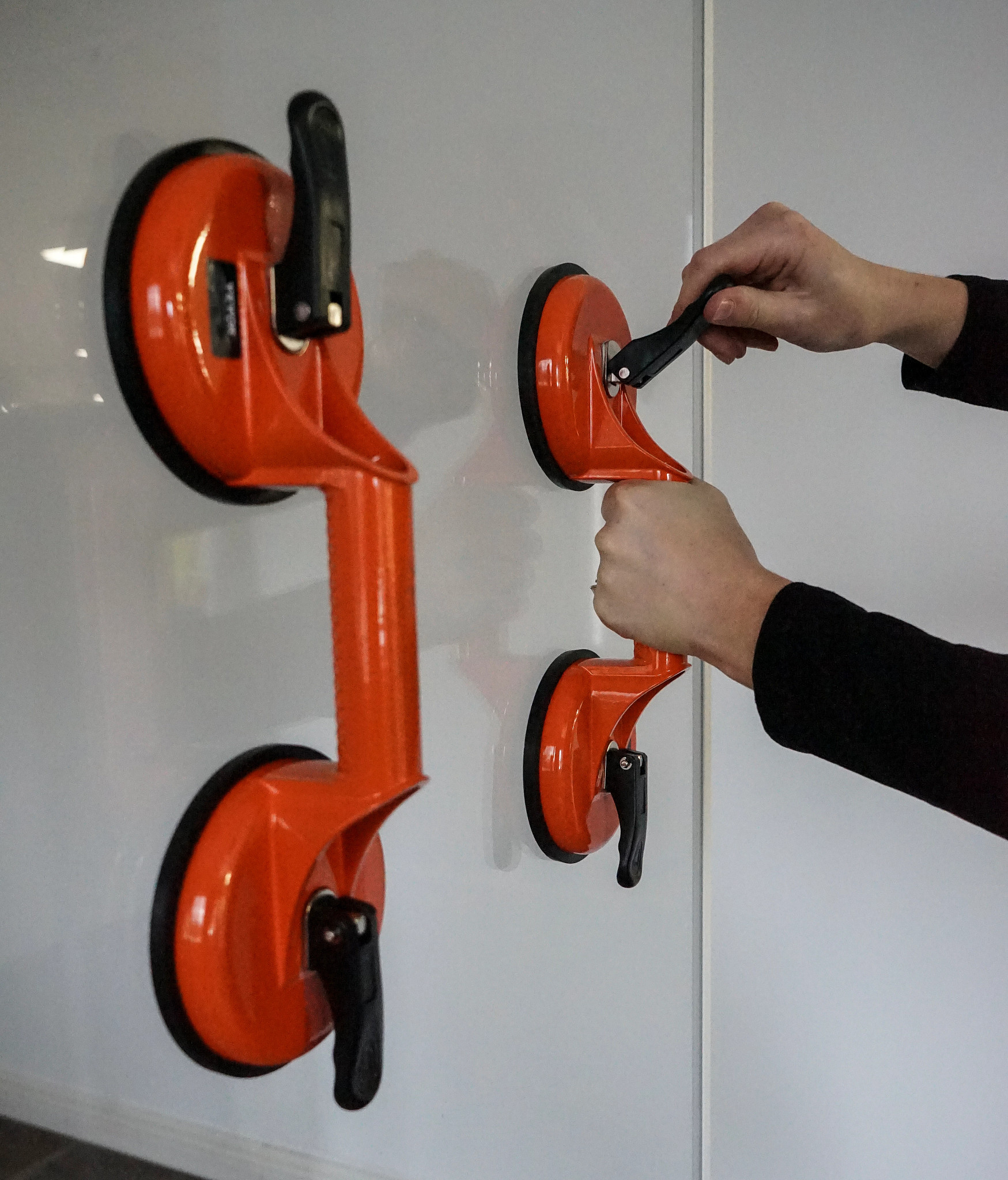 These Double Suction Cup (2-Pack) provide a safe, secure way to manually handle and transport plate glass, acrylic and vitrines in exhibits. The 4.7" diameter rubber suction cups lift up to 300 lbs. and feature suction pads and lever lock cups for a secure grip.
