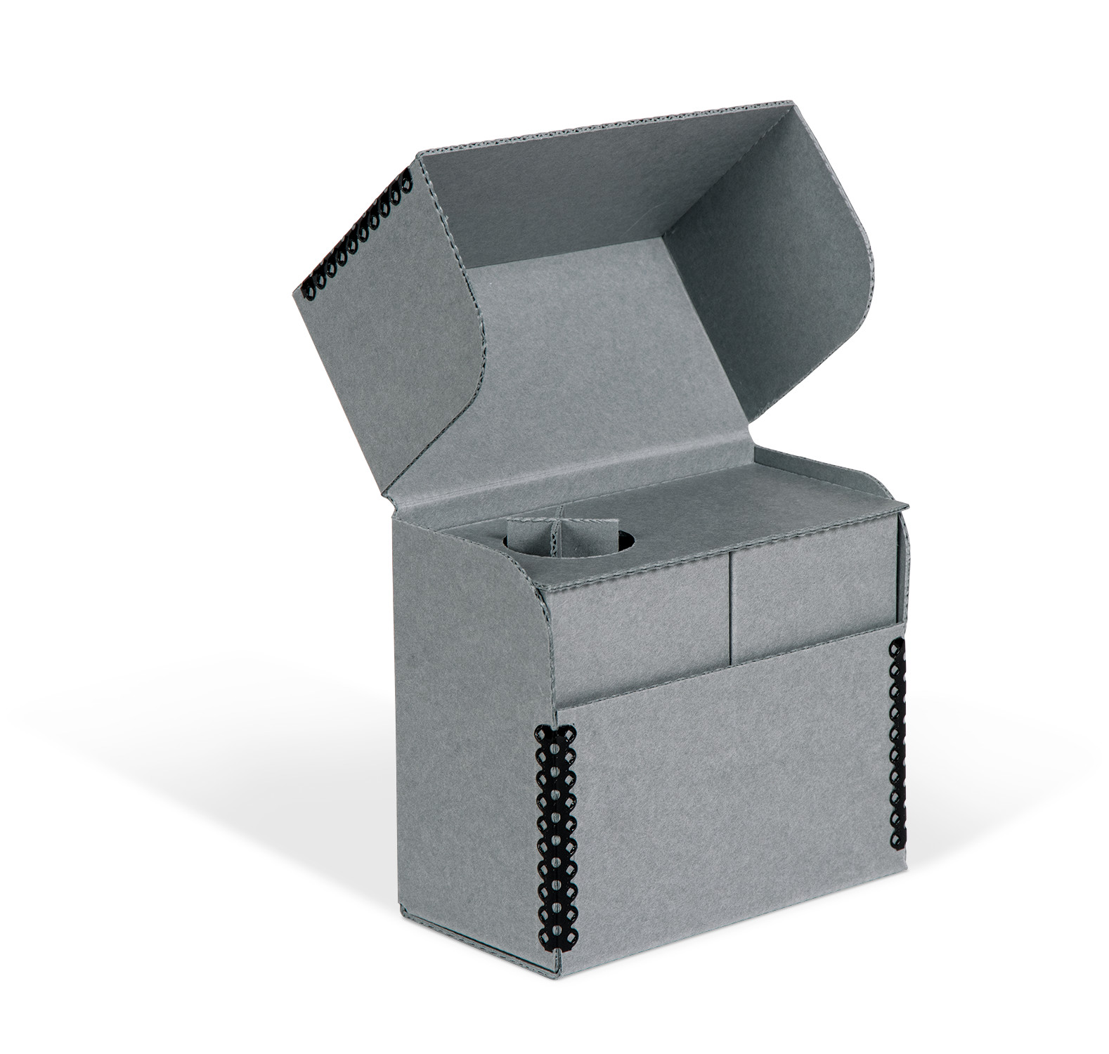 Store your wax cylinder and original container together with the Gaylord Archival® Wax Cylinder Box. The box has two separate compartments to keep the two pieces together but prevent any damage caused by old, cotton-lined packaging. The spindle support is designed to make removal easy without touching the delicate surface of the cylinder. The flip-top lid protects the items from damage caused by dust, dirt and light.
