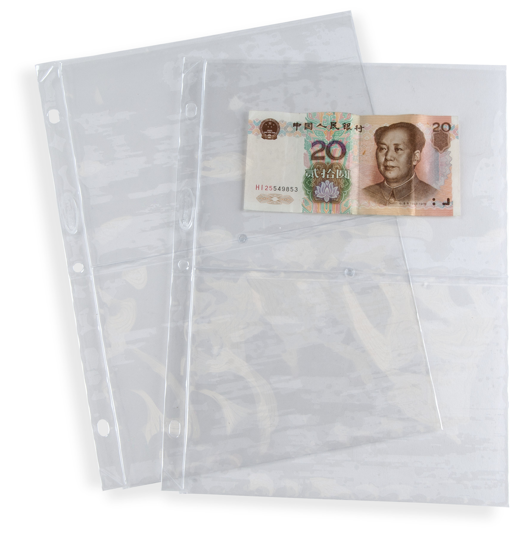 Store and display banknotes safely in this Archival Polyester 2-Pocket Currency Page with individual pockets. The 11 1/2H x 8 1/8"W page is punched to fit in 3-ring binders.
