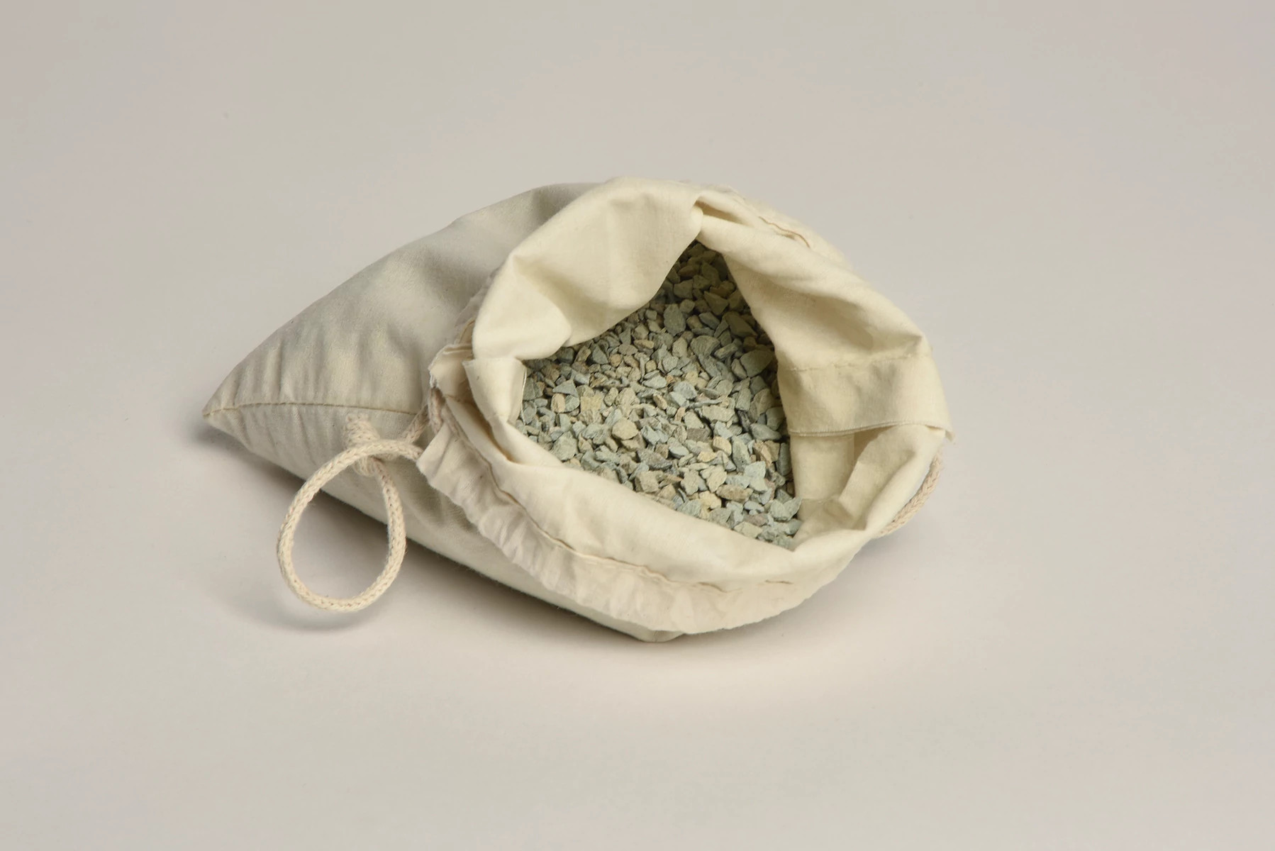 - Reusable, inert, highly absorbent granules come in a fabric pouch