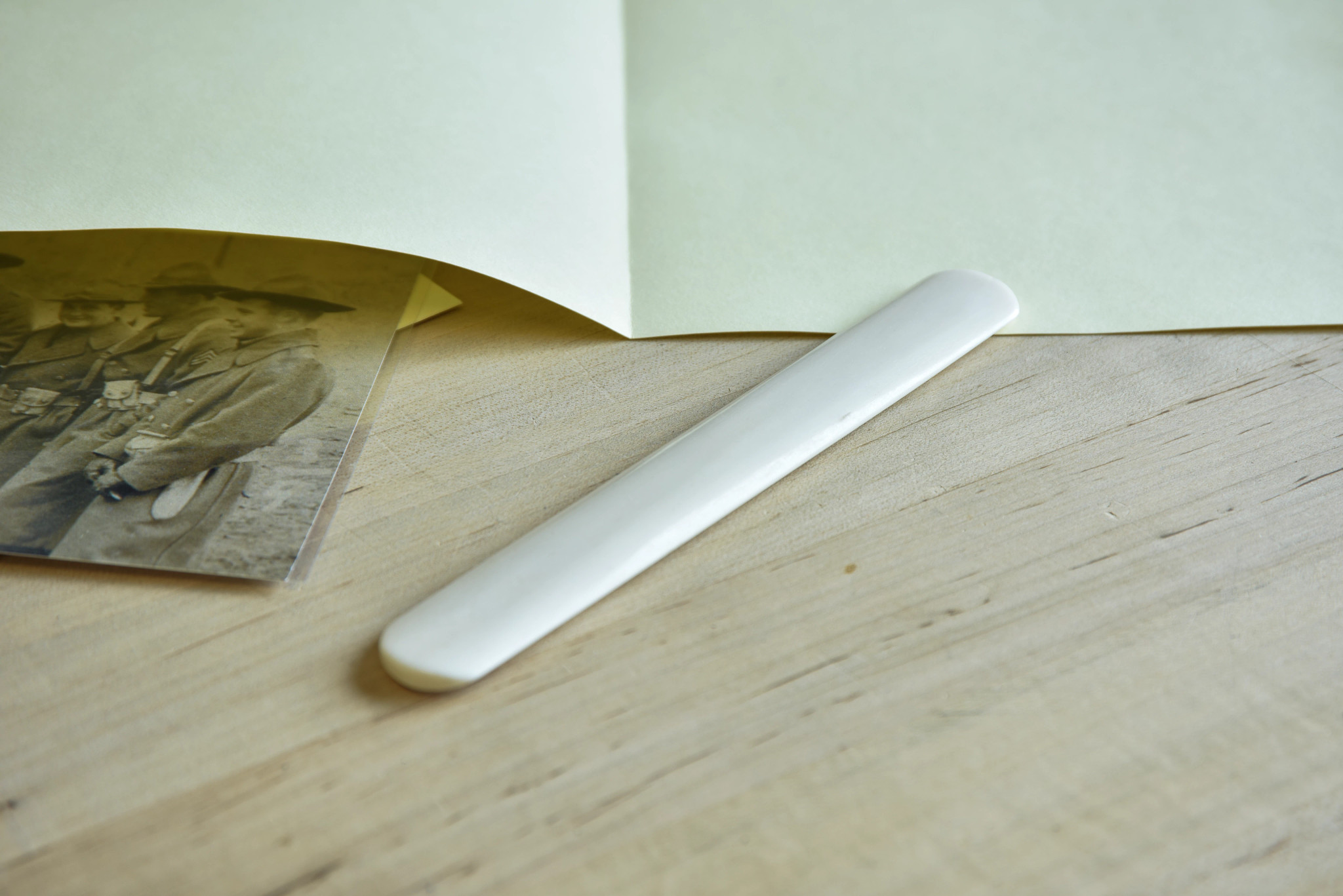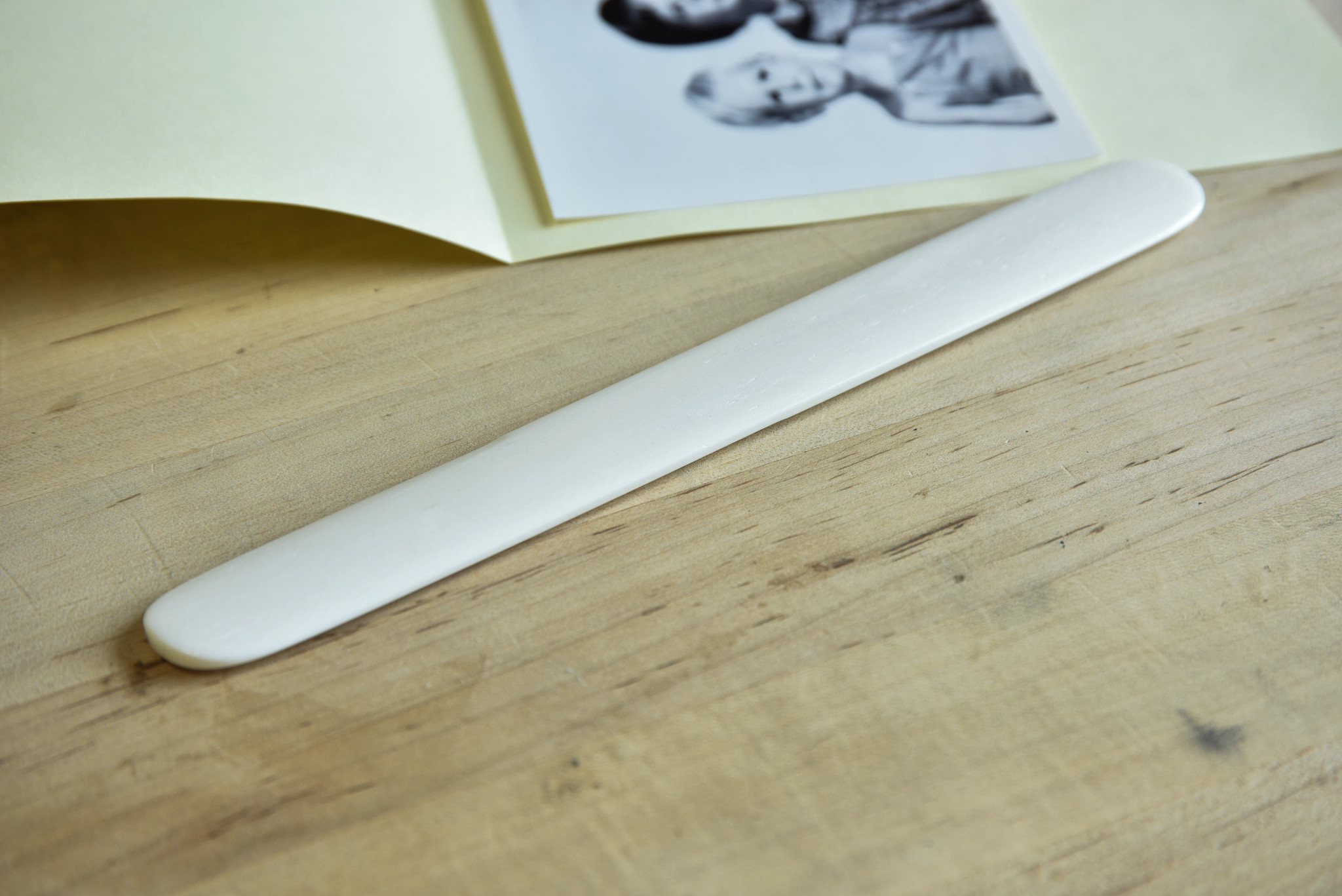 Use this Genuine Bone Folder for turning corners on cloth and leather, scoring paper, folding, smoothing and burnishing surfaces. The folder is rounded at both ends.