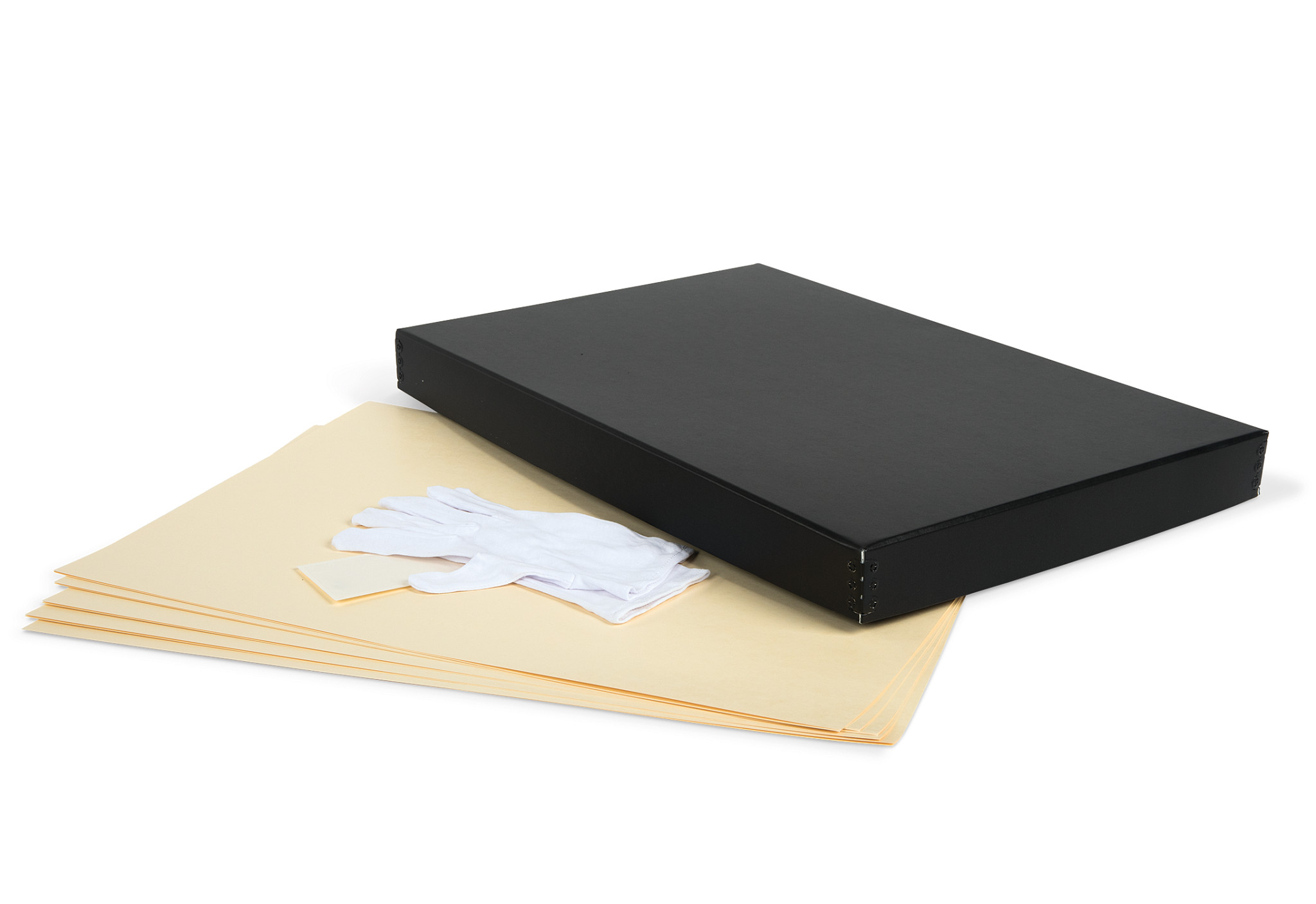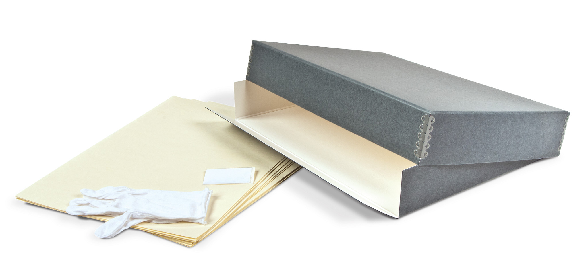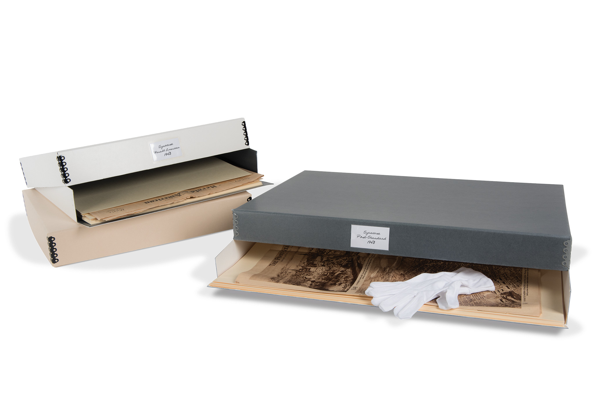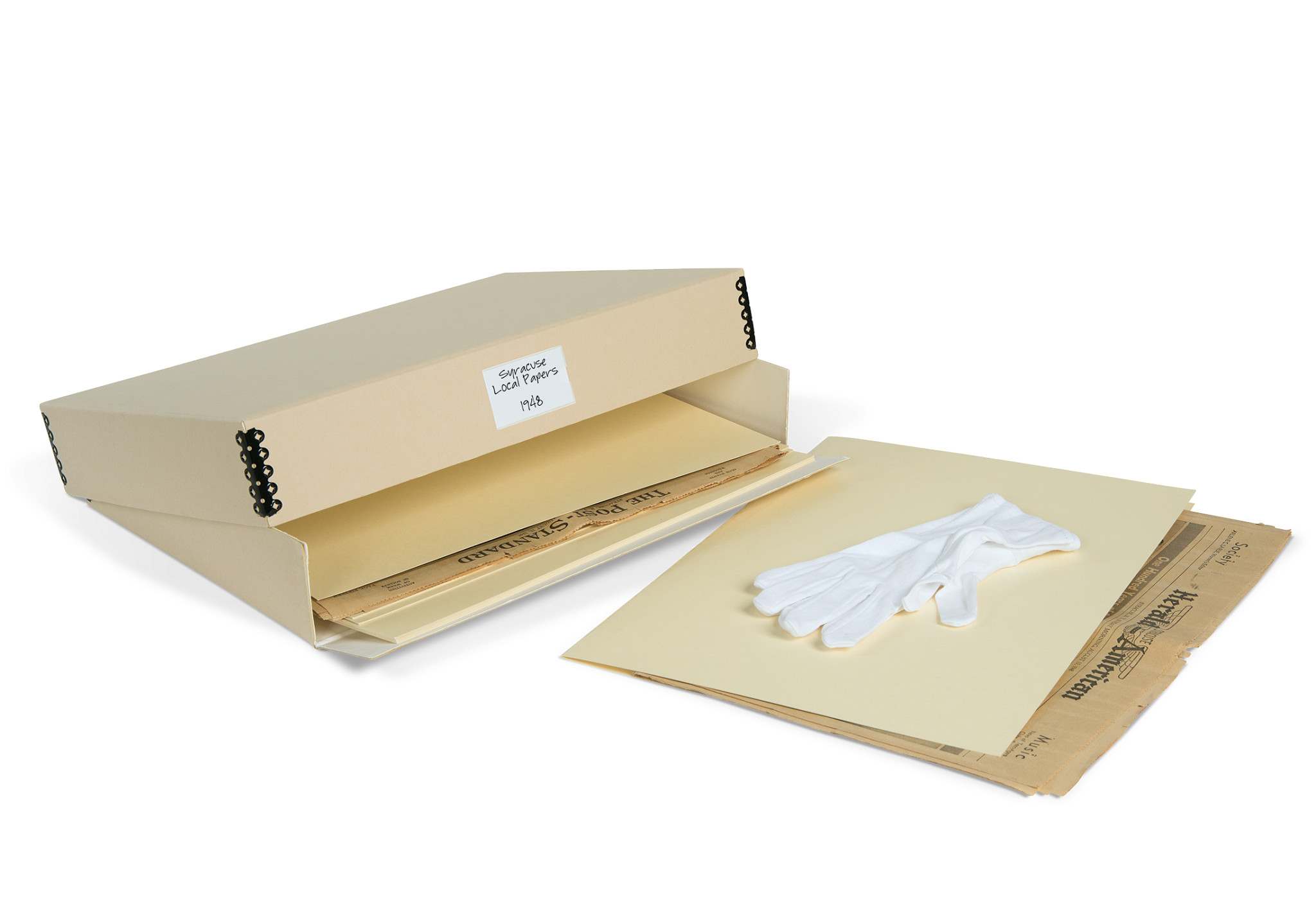 Our Gaylord Archival® Newspaper Preservation Kit has everything you need to organize and safely store your vintage and important newspapers for generations. The sturdy metal-edged box is large enough to hold unfolded newspapers and has a drop-front on the long side to enable easy removal of items. The deep lid protects against light and dust, and metal edges add strength and support. File folders, a label pocket and white gloves complete the kit.