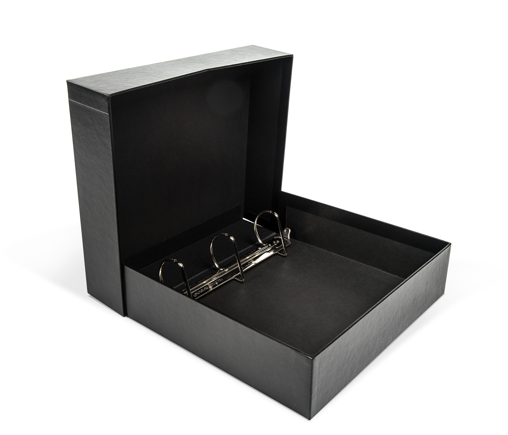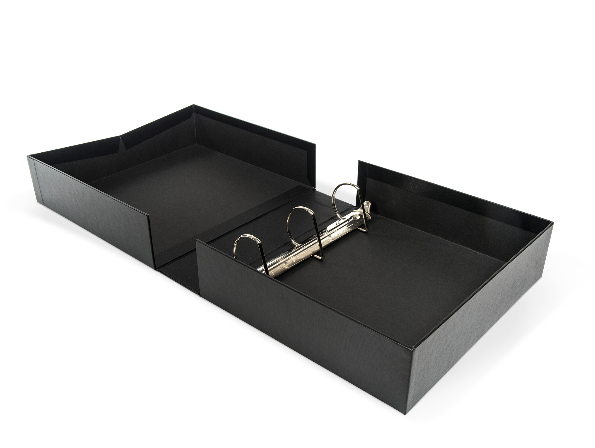 Elegant and fully enclosed, this 2 1/2" D-Ring Box Album is ideal for use as a presentation binder. When opened, it lies flat for safe viewing. Ideal for storing negatives, prints, letters and more.