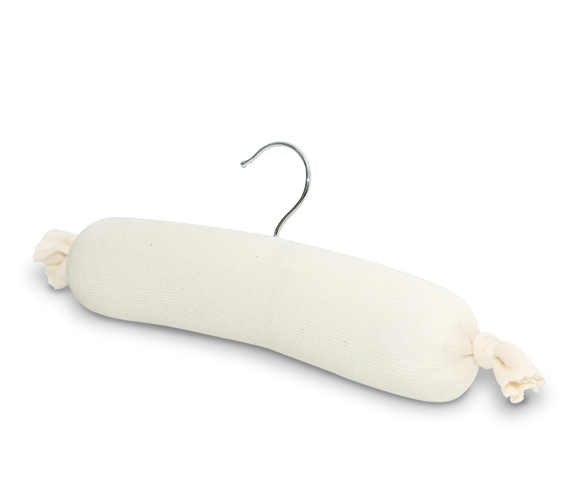 Handmade by a professional collections manager, the Hangerbee Wooden Core Padded Hanger with Chrome Hook is ideal for long-term storage of uniforms, costumes, wedding dresses and other valuable garments. Made from a solid wood core padded with polyethylene padding and 100% polyester needlepunched batting, wrapped in 100% cotton stockinette that has been prewashed with artifact-safe Orvus soap. Hanger features a chrome swivel hook.