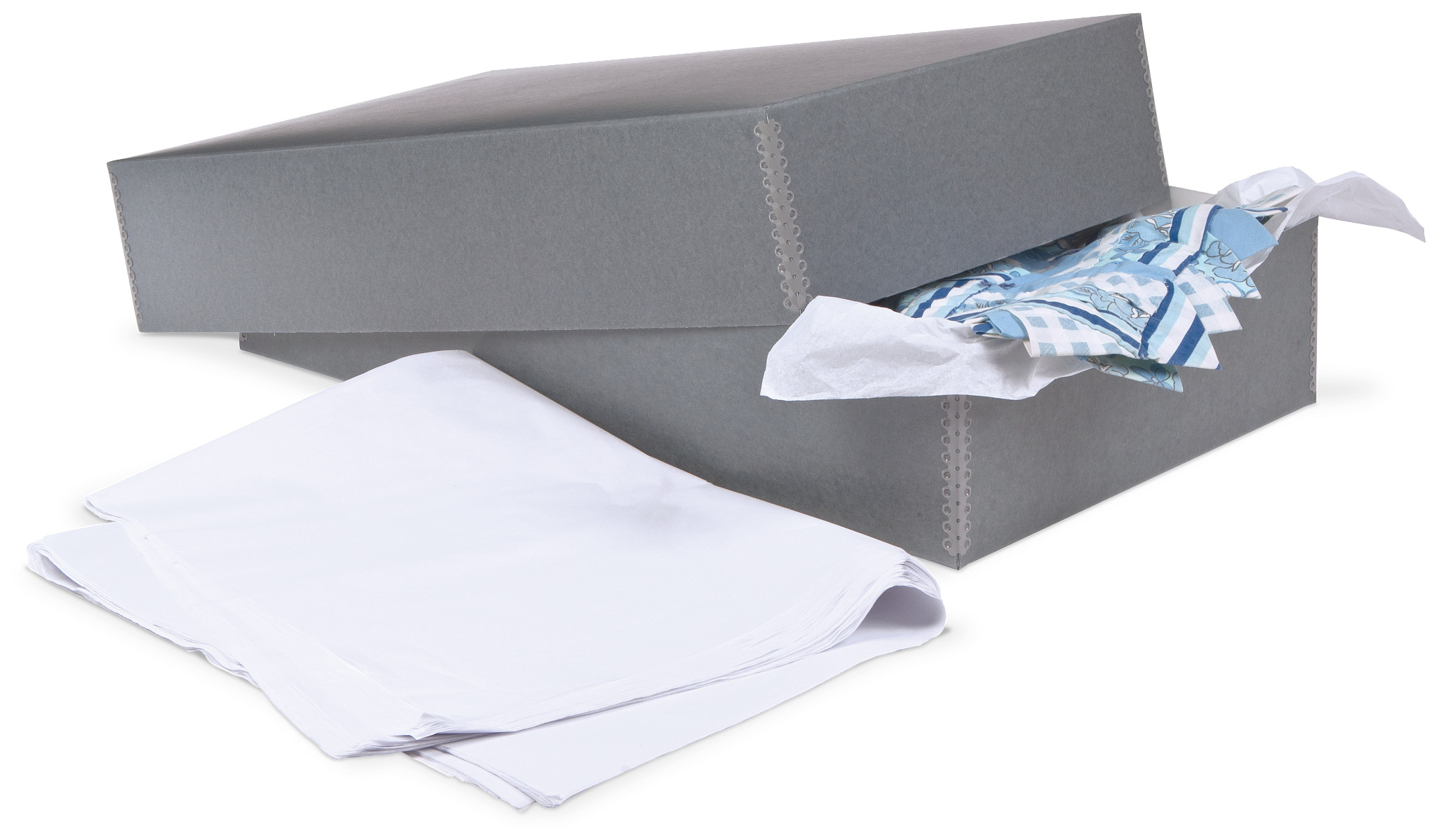 Protect and preserve gowns, quilts and costumes with our Gaylord Archival® Blue/Grey Barrier Board Textile Box with Tissue. It includes 25 sheets of 30 x 40" tissue for interleaving folds and wrapping textiles.