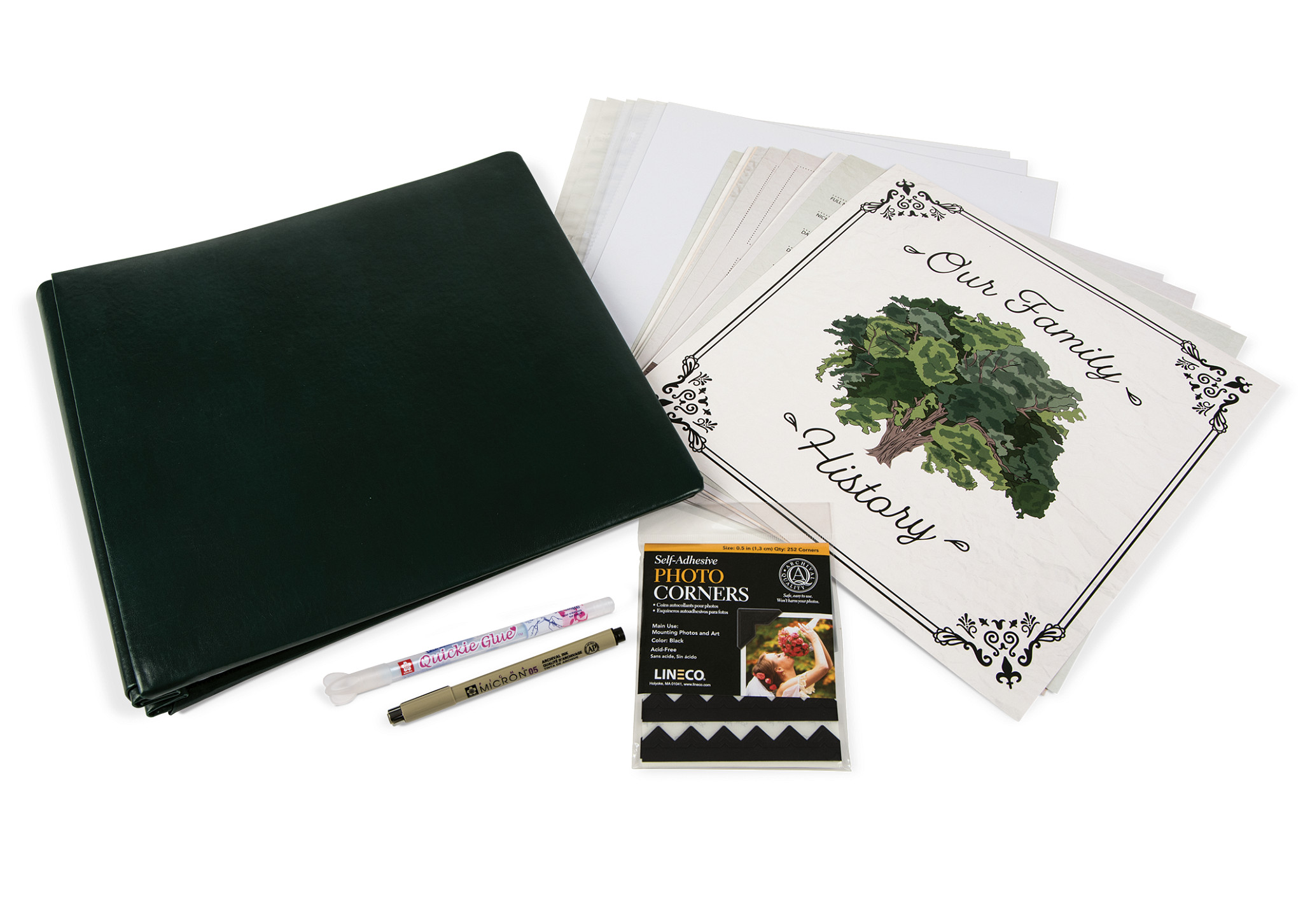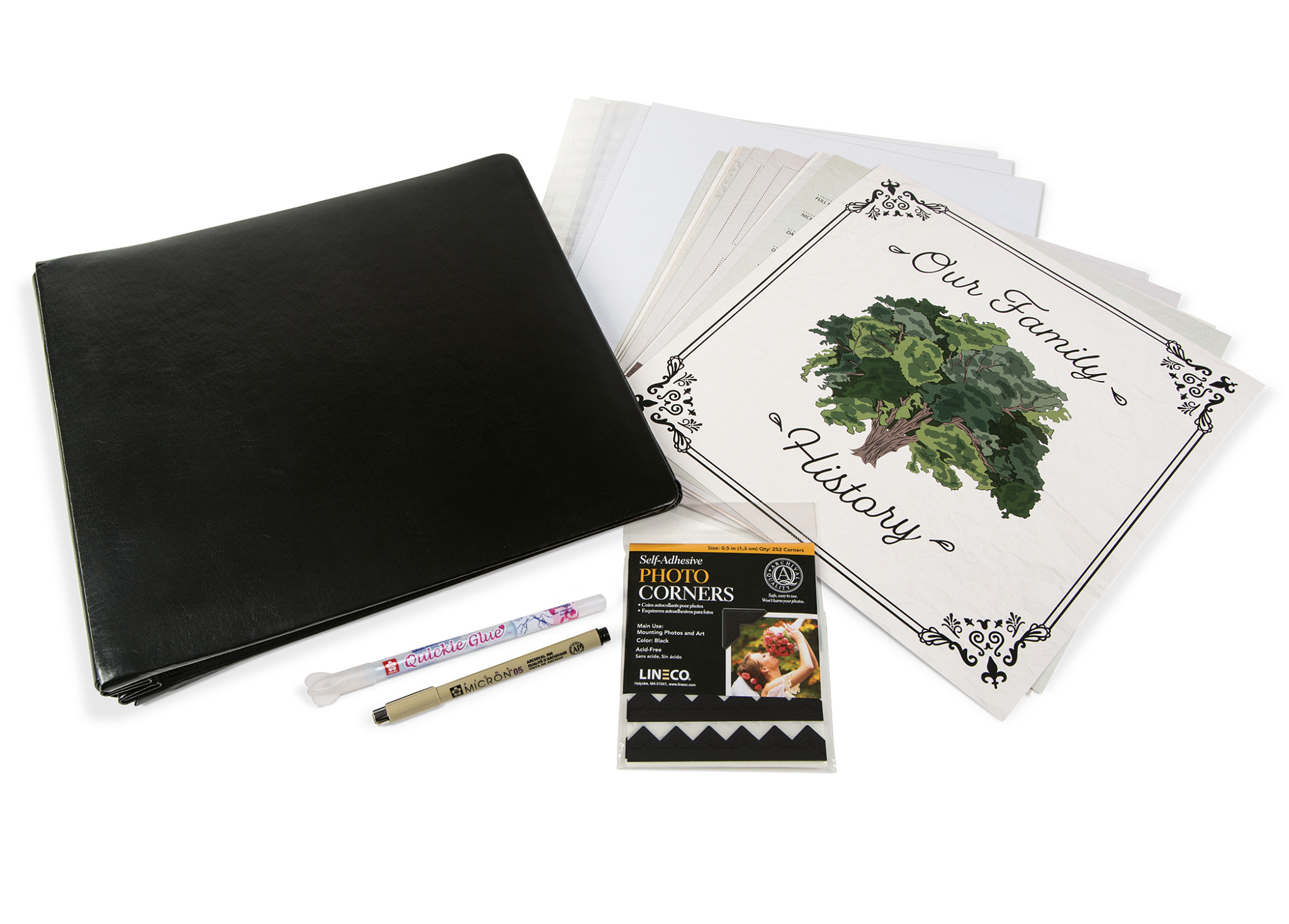Telling your story can be quite an undertaking, but with this Gaylord Archival® Our Family History Genealogy Album Kit you can document your family's history for future generations. We've designed these pages to provide you with beautifully simple pages with ample space for writing, journaling and photographs. We've included photo corners, a glue pen and a black pen for adding your own touch to a beautiful family treasure.