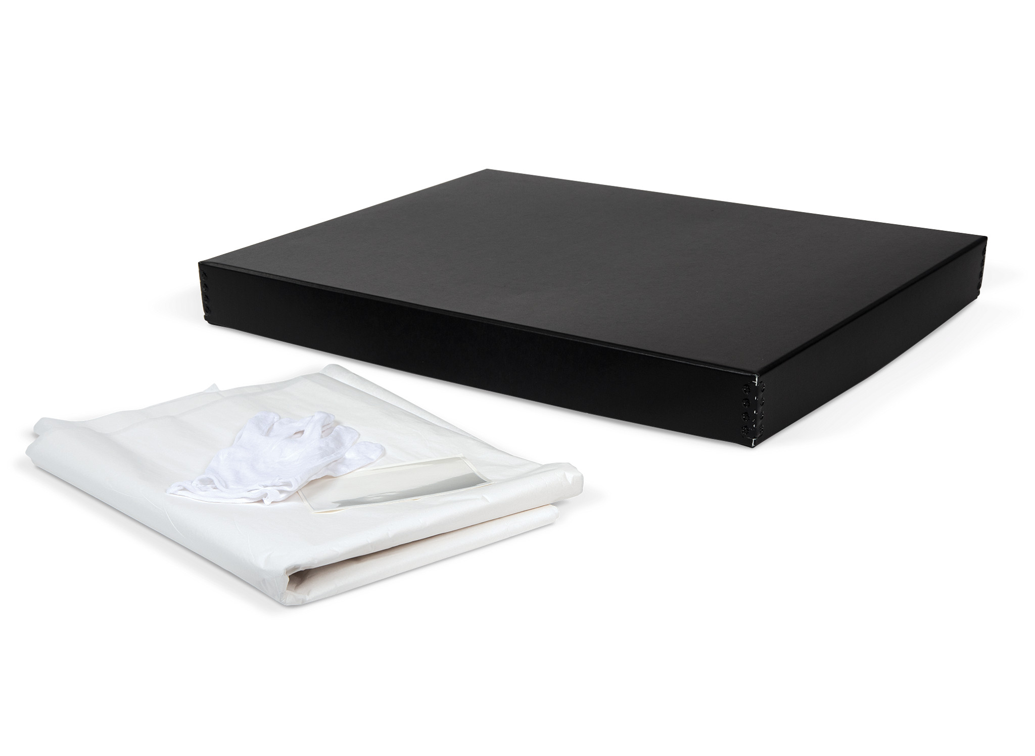 • Includes box, 25 sheets of 30 x 40" unbuffered tissue, white cotton gloves, and a label to identify contents