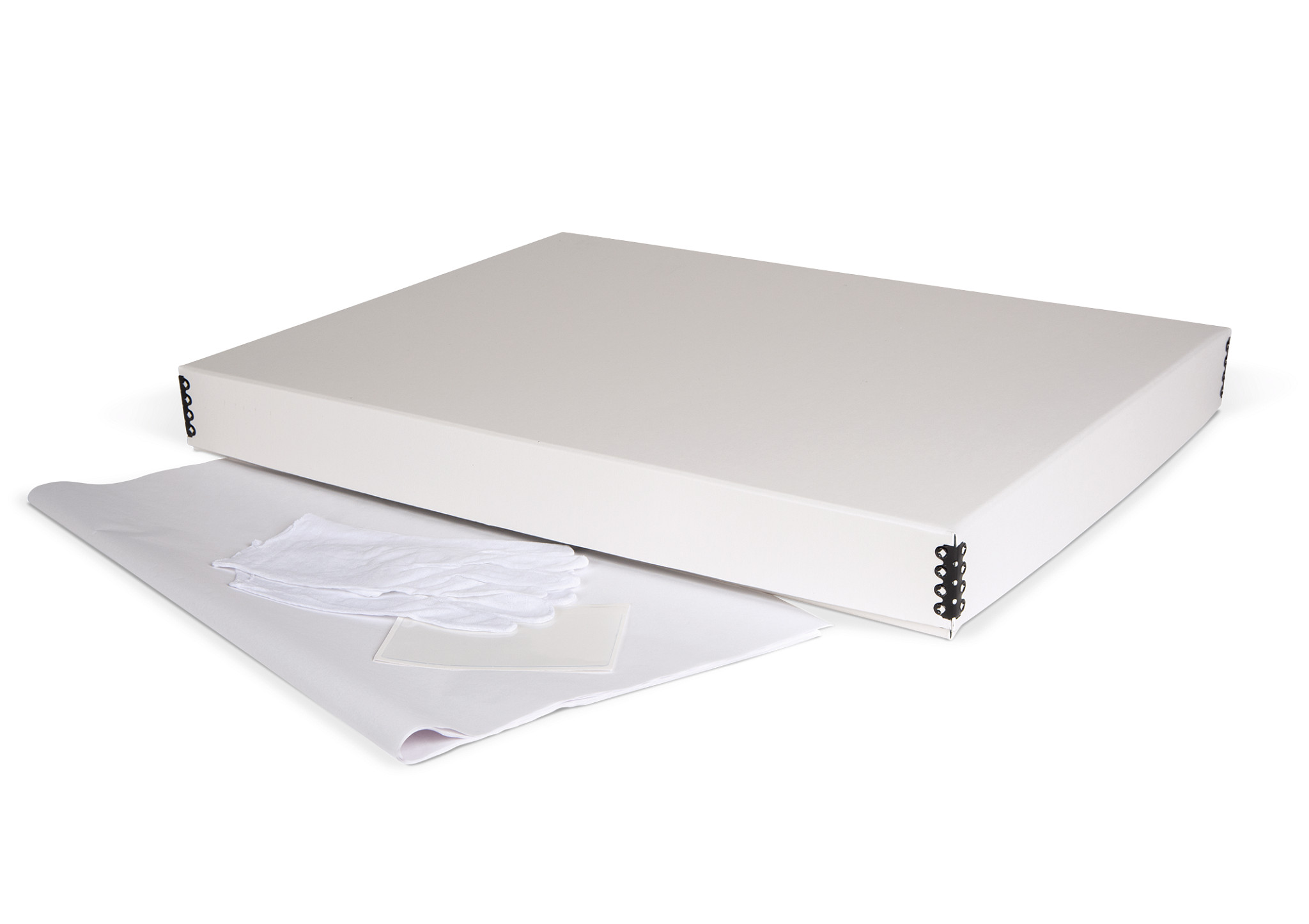 - Includes box, 25 sheets of 30 x 40" unbuffered tissue, white cotton gloves, and a label to identify contents