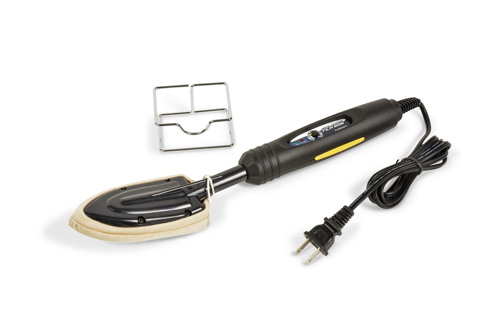 The Adjustable Temperature 110V Tacking Iron is compact and handheld and features a 5 x 1 3/4” shoe with a tapered head to apply heat in small, harder to access spaces. The shoe’s rounded sides and nonstick coating allow for smooth application of a variety of heat-set adhesive materials. The temperature is adjustable from 150°F to 420°F and with +/-3° accuracy. Includes extra-long 12’ power cord and a metal resting stand.
