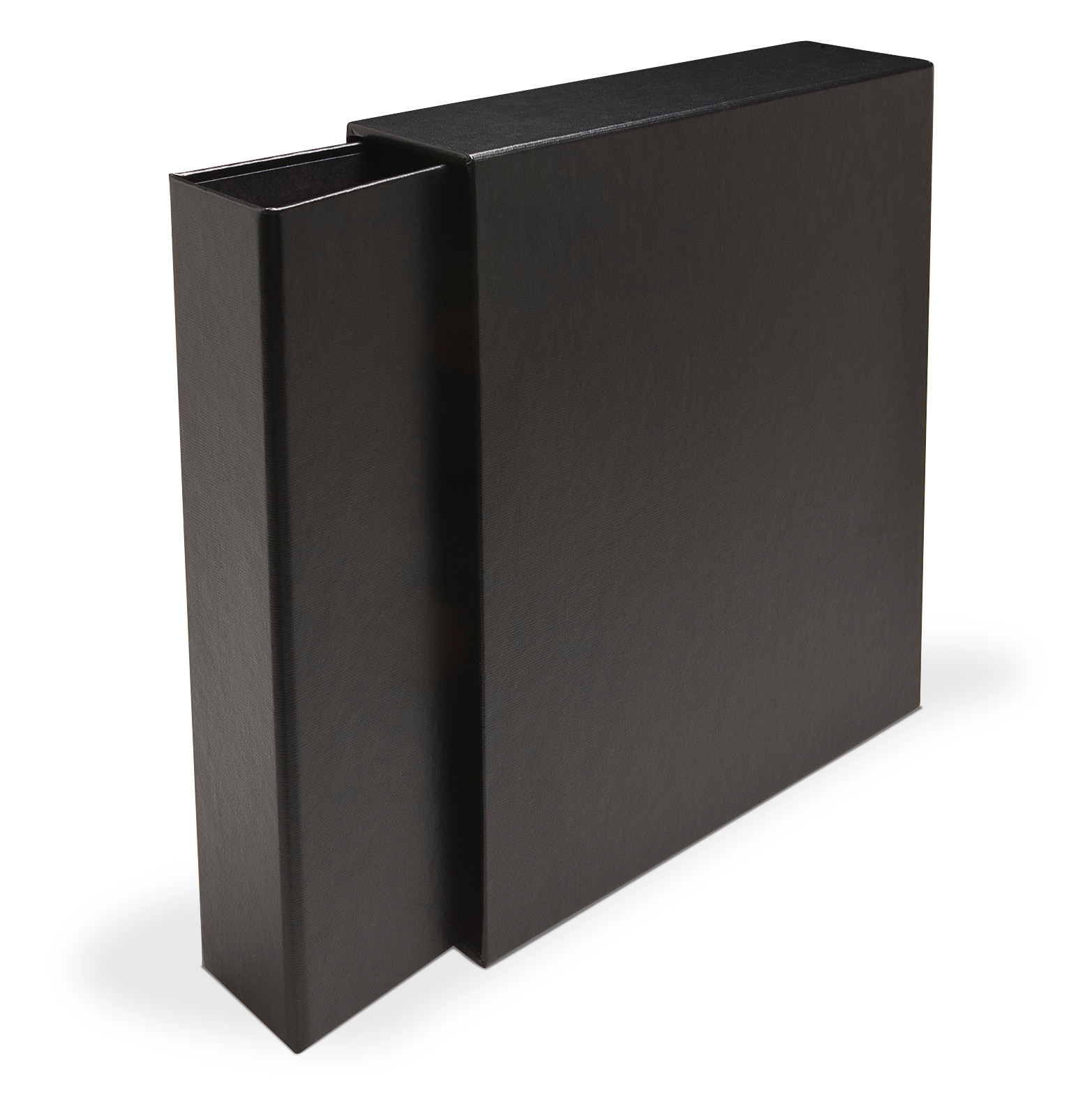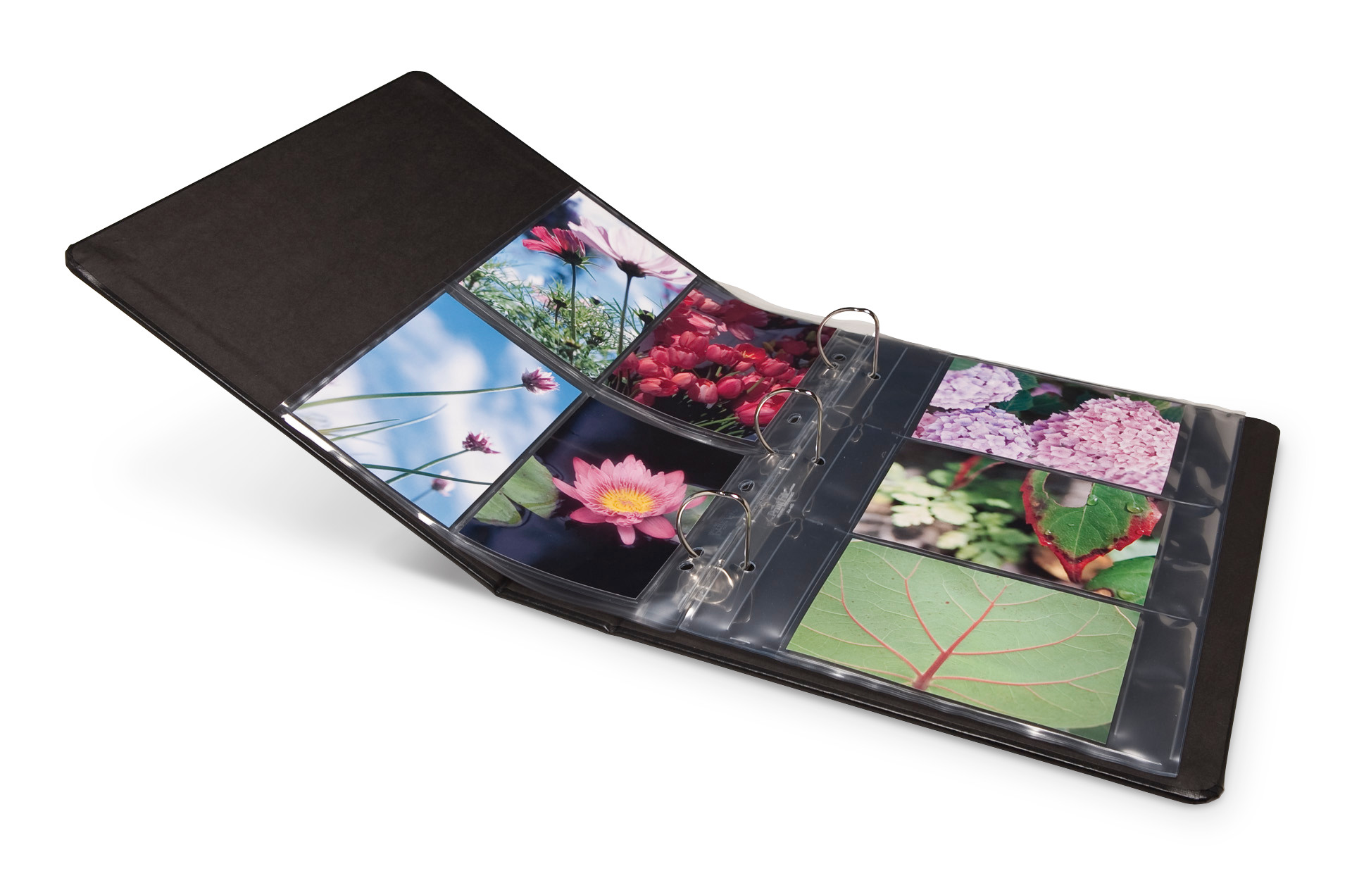 This sophisticated Print File® 1 1/2" D-Ring Premium Oversize Photo Album features a black buckram-textured exterior, a polyester laminated black interior and silver D-rings, making it ideal for high-impact presentations. Add a matching slipcase (sold separately) for added protection against dust, light and pollutants.